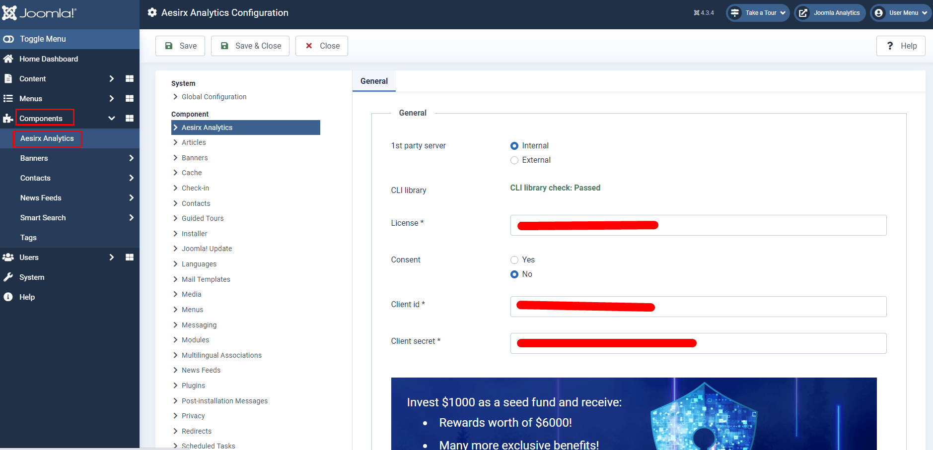 - For Internal, you will need to install the CLI Library and enter the CLIENT_ID, CLIENT_SECRET and Licence for Aesirx Analytics from https://signup.aesirx.io/